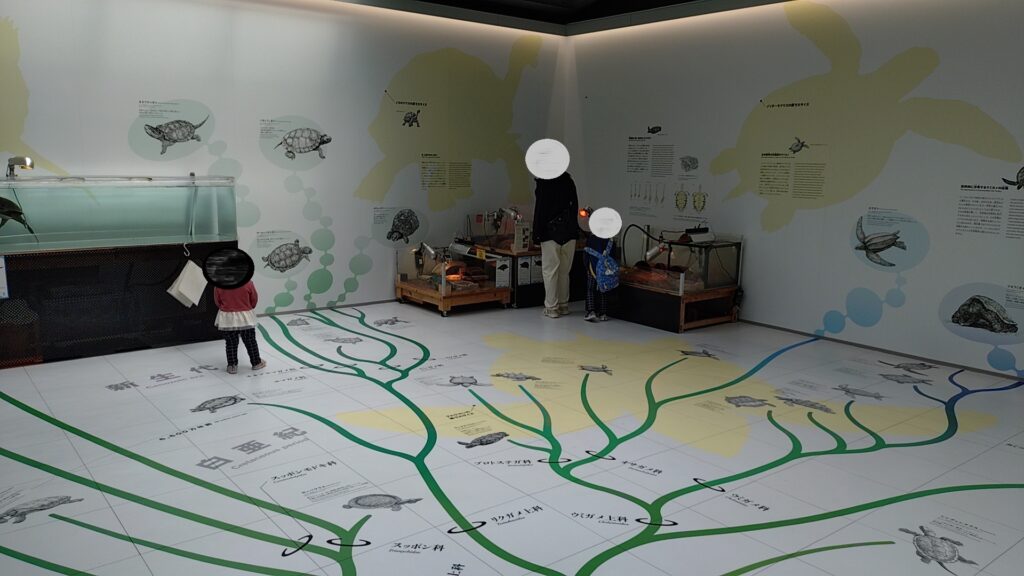数種類のカメの展示と共にフロア全体でカメのルーツを学ぶことができる部屋がまず最初にあります