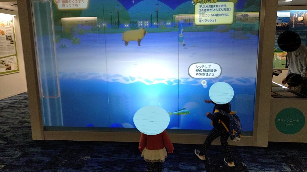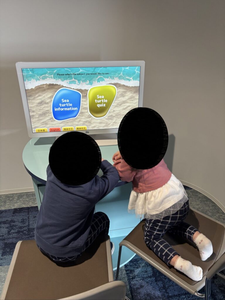 そこを過ぎると、ウミガメの生態が学べるクイズ/資料閲覧PCがあります。💻