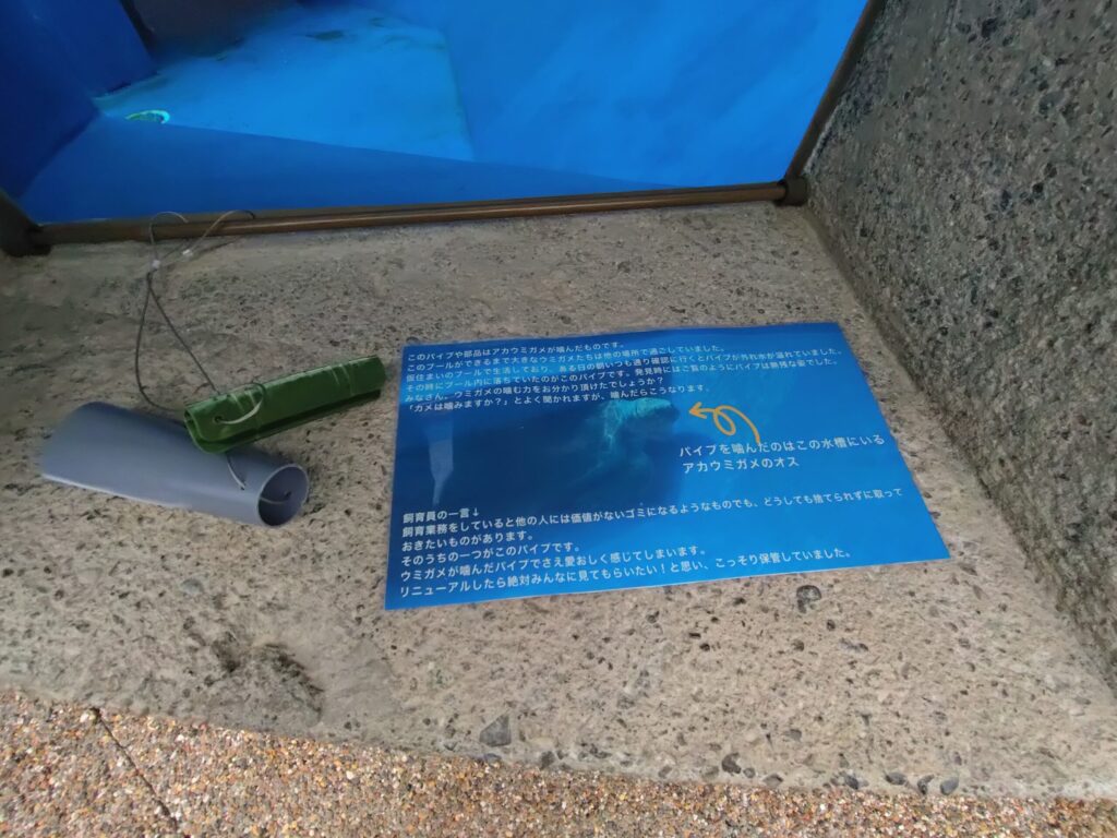 また、水槽には過去ウミガメが破壊した水槽内で使用されていた部品の展示もありました。